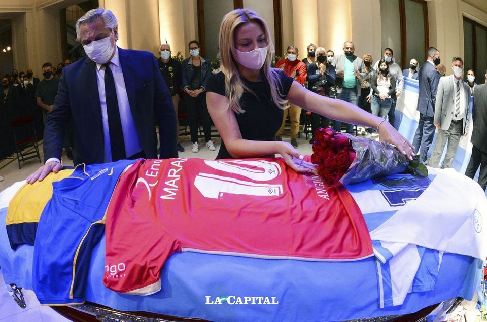 Visiblemente conmovido por la pérdida, el mandatario llegó frente al ataúd y colocó sobre él una camiseta de Argentinos Juniors y dos pañuelos blancos, símbolo de las Abuelas y Madres de Plaza de Mayo, mientras que la primera dama Fabiola Yañez llevó un ramo de rosas rojas.