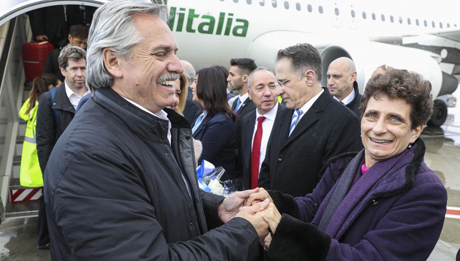 Al mandatario lo acompañan la primera dama, Fabiola Yáñez, el canciller, Felipe Solá; el secretario de Asuntos Estratégicos, Gustavo Beliz; el secretario de Comunicación y Prensa, Juan Pablo Biondi; el gobernador de la provincia de Buenos Aires, Axel Kicillof; el flamante embajador en Israel, Sergio Urribarri, y el diputado Eduardo Valdés.
