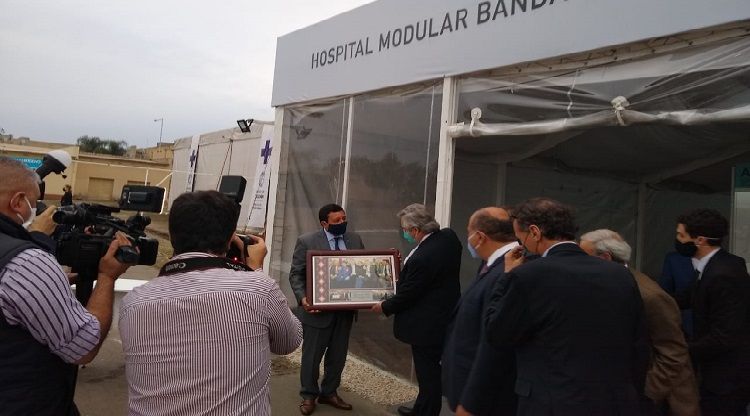 Tras su paso por la fábrica de Scania producción Tucumán, el presidente Alberto Fernández y el gobernador Juan Manzur, arribaron a la localidad de Banda del Río Salí, para recorrer el centro de asistencia modular anexo al hospital Eva Perón, donde se acondicionaron las instalaciones para enfrentar la pandemia por COVID-19 y alojar allí a 120 pacientes de mediana o baja complejidad.