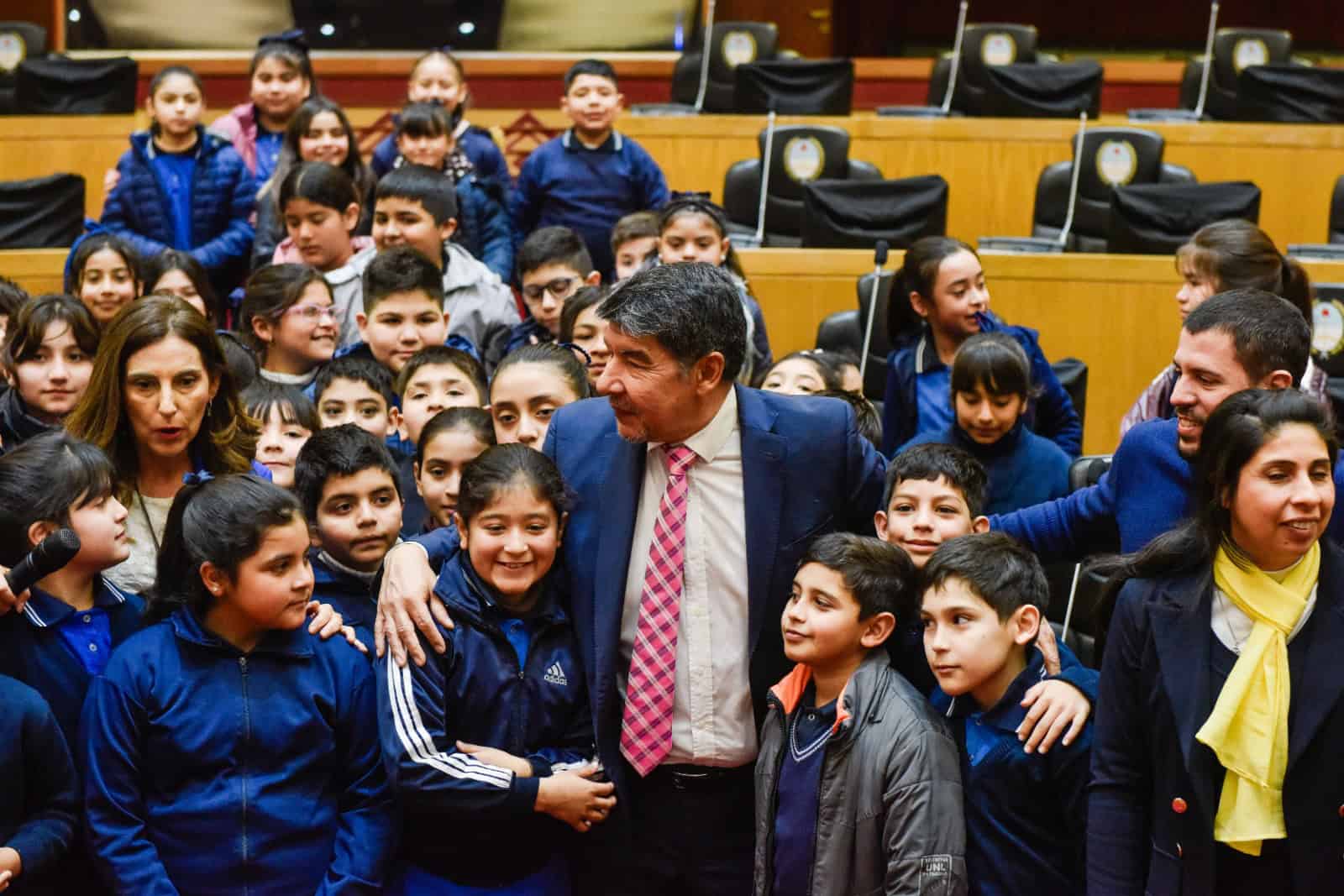 El vicegobernador a cargo del Poder Ejecutivo, Miguel Acevedo, junto a la legisladora Carolina Vargas Aignasse, recibieron a la delegación escolar. Este programa, coordinado por el Instituto de Capacitación de la Legislatura, actúa como puente entre la comunidad y el poder legislativo, organizando visitas y capacitaciones.