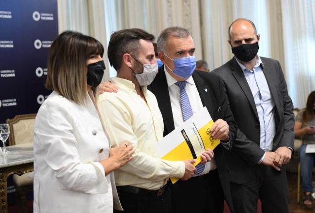 Vivimos un momento histórico que quedará grabado en el corazón de cada uno de ustedes, de los beneficiarios de los créditos Procrear. A partir de hoy, tendrán la posibilidad de cumplir el sueño del techo propio«, destacó Jaldo durante la entrega que se realizó en el Salón Blanco de Casa de Gobierno.