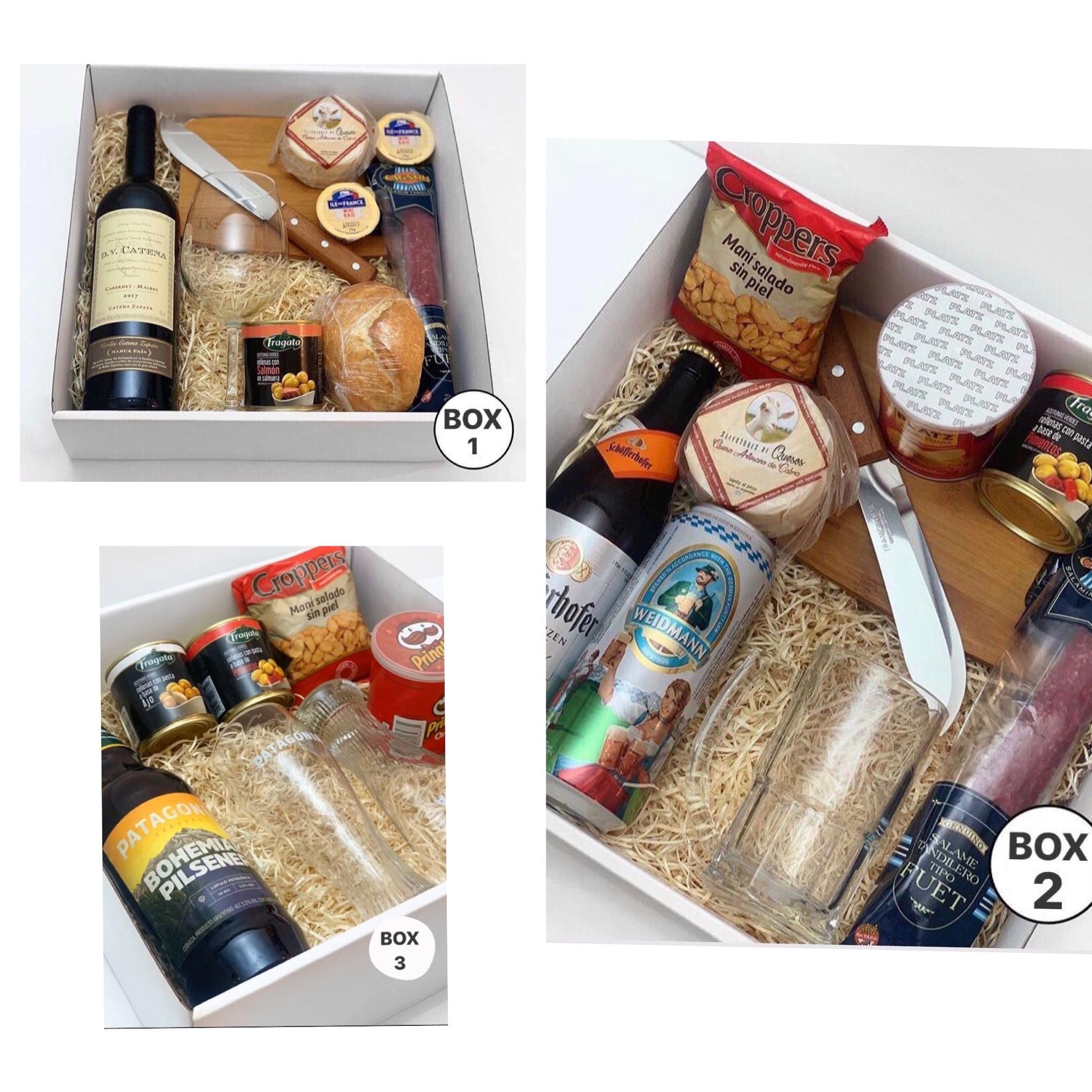 •1) Box Vino Premium: Vino premium (catena zapata/luigi bosca según stock) + Copa de vino + Tablita + Cuchillo Tramontina + 2 quesos brie Franceses + Queso de cabra + Salame Cagnoli + pan + Aceitunas rellenas