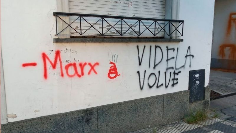 «Videla volvé», «Menos Marx» y «Ni un zurdo más» son los mensajes con los que amaneció este martes la fachada de la sede del Partido de los Trabajadores Sociales – Frente de Izquierda (PTS-FIT), ubicada en calle La Rioja al 700