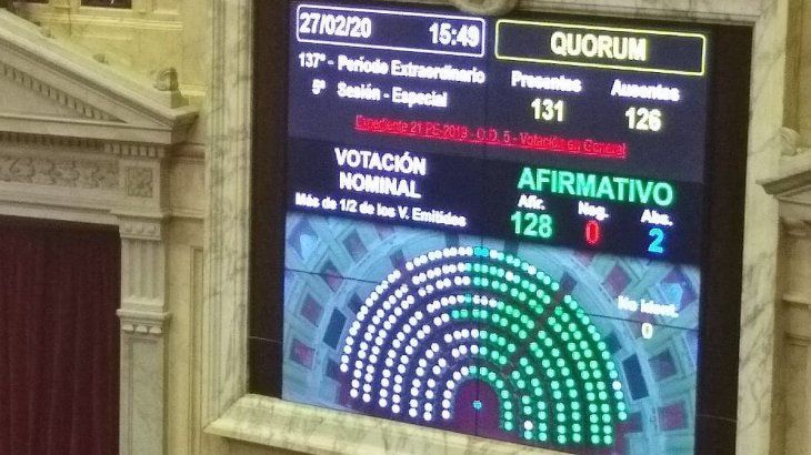 La iniciativa fue sancionada en la Cámara baja por 128 votos a favor y 2 abstenciones. El oficialismo contó con el apoyo del interbloque Unidad y Equidad Federal y del Interbloque Federal. En la votación en particular hubo una modificación. El proyecto pasó al Senado.