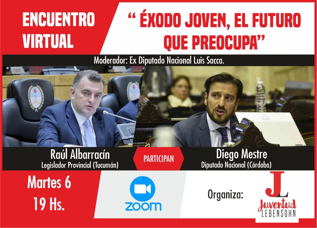 El encuentro contará con la participación del Legislador Raúl Albarracín y el Diputado Nacional por la provincia de Córdoba Diego Mestre; teniendo como moderador al ex Diputado Nacional Luis Sacca. El éxodo joven se plantea como una de las alternativas que más ha circulado en estos días en las redes sociales, puntualmente por la gran crisis económica que atraviesa el país y la falta de oportunidades para desarrollarse.