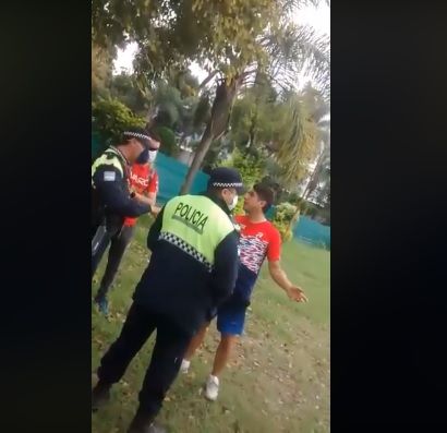 En las imágenes se puede observar como personal policial se acerca a los infractores pidiendo que culminen con la actividad. Se escuchan una serie de excusas de todo tipo por parte de quienes estaban jugando en ese momento.
