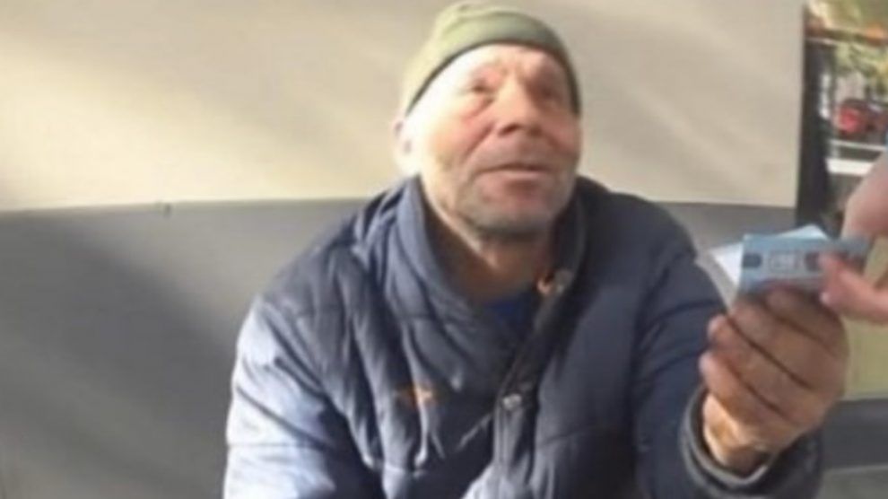 Salió a la calle con su celular y encontró a Gheorge L., que pedía limosna frente a un supermercado. El chico le entregó 20 euros y el paquete de galletitas. Lo grabó todo y lo subió a YouTube. Luego, el mendigo se descompensó.
