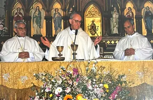 La imagen fue tomada durante una celebración solemne. El altar cubierto por una tela dorada, los cálices en primer plano y un arreglo de flores frente al retablo completan la escena. Detrás, la arquitectura gótica y las imágenes de santos enmarcan un momento que pasó inadvertido durante años, pero que hoy cobra dimensión histórica.