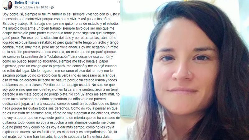 Se trata de Belén Giménez que se desempeña como docente en una escuela de la capital entrerriana. La maestra eligió Facebook para expresar su dolor e indignación por la situación vivida. No solo sé que soy pobre sino que me lo refregaron en la cara, me sentenciaron a no tener derecho a un mate porque no pongo plata”, expresa el posteo.