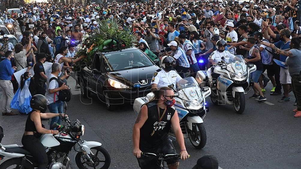 El cortejo fúnebre del astro argentino salió de la Casa Rosada a las 17.47 y se dirigió al cementerio de Bella Vista para darle descanso a sus restos, luego de precipitarse el final velatorio ante el desborde de los fanáticos en la sede de Gobierno y sus inmediaciones.