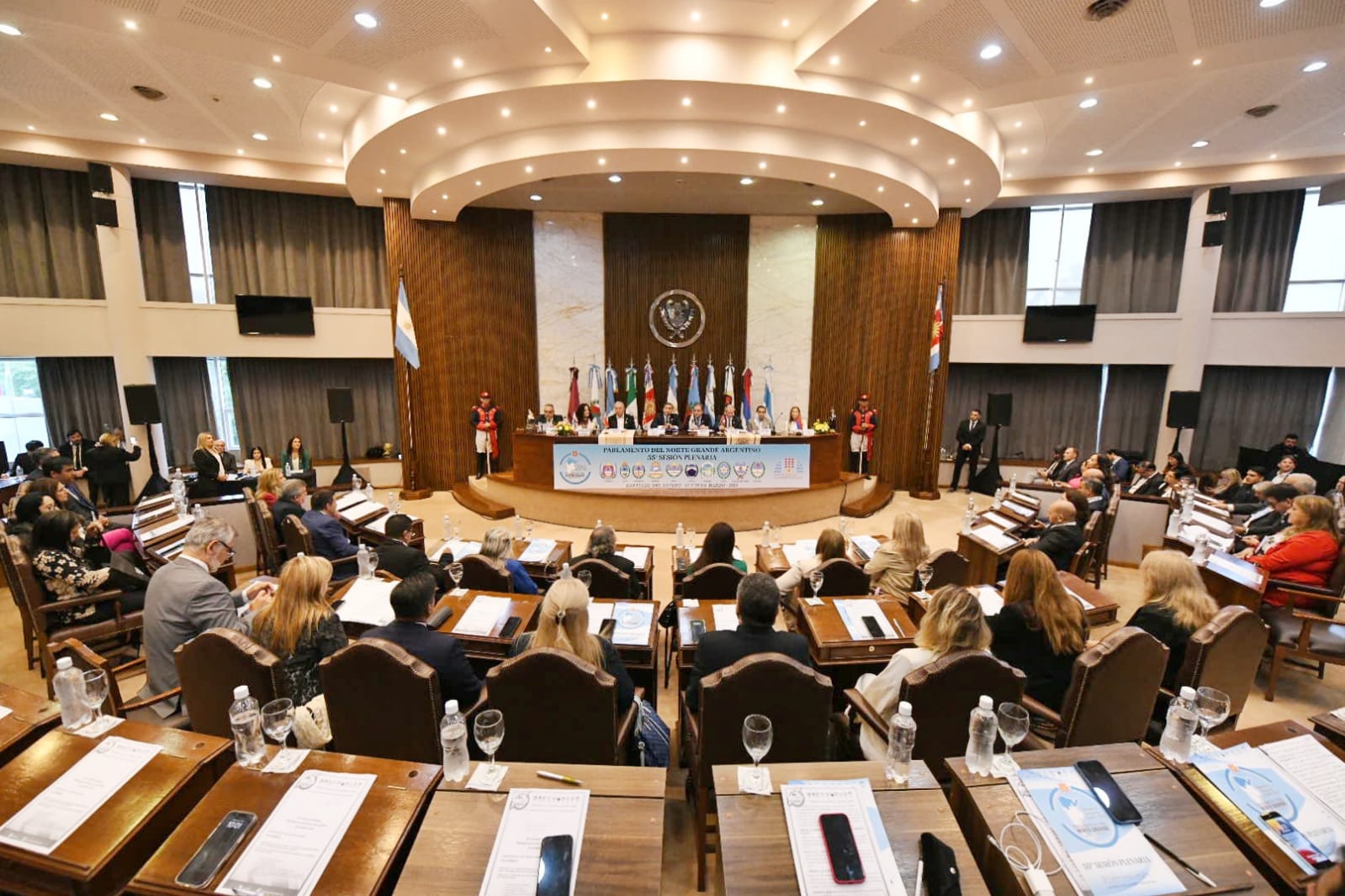 La 55° sesión plenaria del Parlamento del Norte Grande tuvo lugar esta mañana en Santiago del Estero. El acto institucional estuvo encabezado por Carlos Silva Neder, Antonio Marocco, Alberto Bernis y Rubén Dusso, vicegobernadores de Santiago del Estero, Salta, Jujuy y Catamarca, respectivamente; el presidente subrogante de la Legislatura de Tucumán, Sergio Mansilla; la vicepresidenta segunda Teresa Luna, en representación de la Rioja; Norma Sawicz, vicepresidenta del bloque oficialista en representación de Misiones; y el dr. Luis Fernando Herrera, secretario parlamentario del plenario.