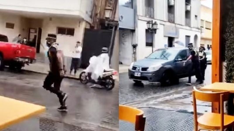 El hombre avanza a gran velocidad por calle 9 de julio y dobla por calle General Paz, al llegar a la avenida Saenz Peña fue interceptado por una oficial que escuchó la situación por radio, e intentó obstruir su paso con la bicicleta, su intervención no tuvo éxito y el sujeto continúo su desplazamiento.