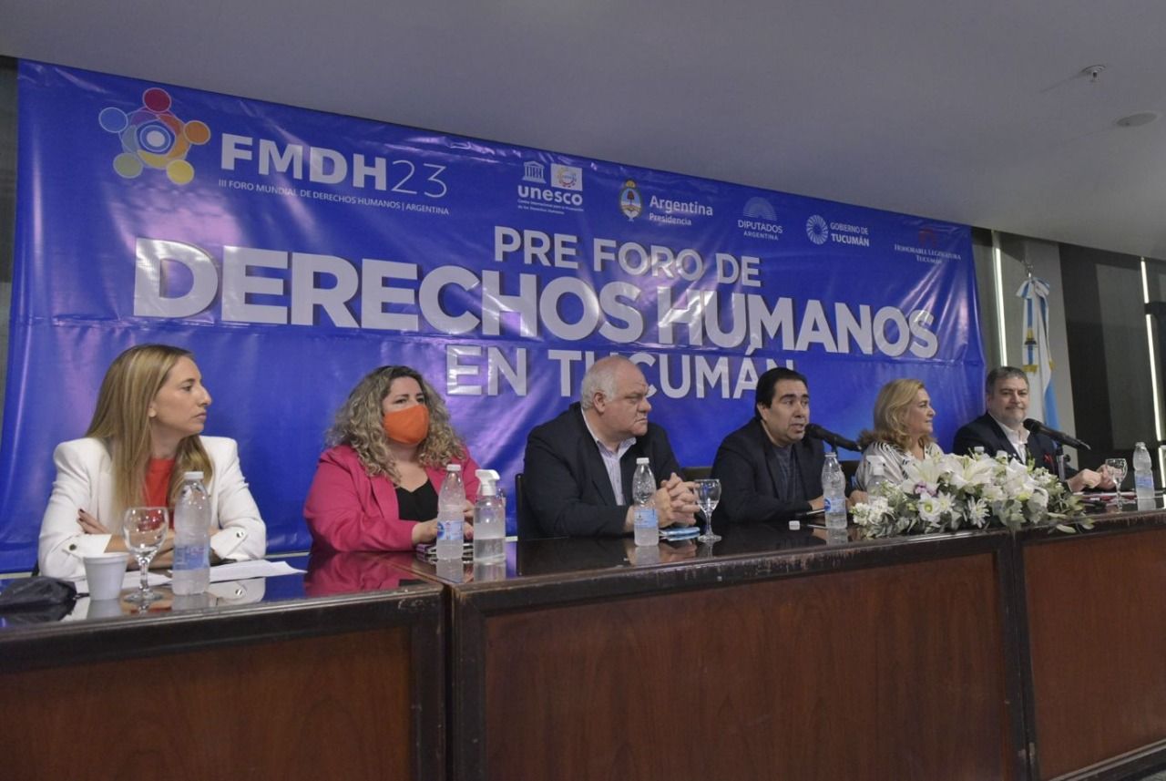 En el hall central de la Legislatura de Tucumán, se llevó a cabo el Pre Foro Mundial de Derechos Humanos, evento que fue impulsado por la diputada nacional, Rossana Chahla; y la acompañaron; el vicegobernador Sergio Mansilla; el Presidente de la Corte Suprema de Justicia, Daniel Leiva; el Ministro Pupilar de la Defensa, Washington Navarro; el Secretario de Derechos Humanos de Nación, Horacio Pietragalla Corti; la directora Ejecutiva CIPDH (centro internacional para la promoción de los derechos humanos), UNESCO, Fernanda Gil Lozano; el Presidente de la Comisión de Derechos humanos de la HLT, el legislador Federico Masso; el Secretario Ejecutivo del Foro Internacional, Pablo Gentili; la Secretaria de Cambio Climático del Ministerio de Desarrollo de la Nación, Cecilia Nicolini; y la Secretaria de Derechos Humanos de Tucumán, Erika Brunotto.