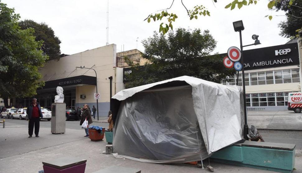Por dentro es como una precaria vivienda sin paredes, pero con grandes plásticos que no permiten que ingrese el viento frío. Eso sí: tiene piso y bancos de cemento alisado. La estructura principal es un gazebo que la familia Di Meglio colocó en el boulevard Lavalle, justo al frente de la entrada de emergencias del hospital Padilla. Están allí por una trágica razón: el 28 de junio le dispararon en la cabeza para robarle la moto a Yoel Jesús David Di Meglio, por lo que tuvieron que internarlo en estado muy grave. Desde entonces, para estar cerca, para asistir a todas las visitas sin falta y para no gastar tanto en ómnibus o en comida, sus padres se instalaron en el espacio público.