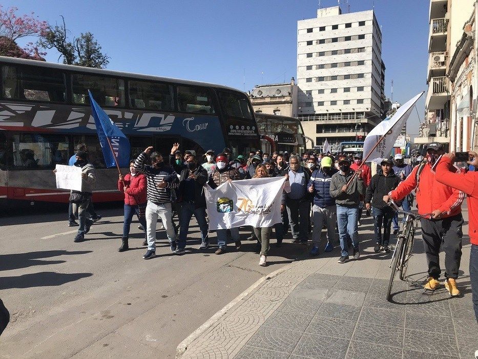 Obreros del limón nucleados en la Unión Argentina de Trabajadores Rurales y Estibadores (UATRE) llevan adelante una manifestación frente a Casa de Gobierno. La protesta, que impide el paso de vehículos por calle San Martín y en el lugar, es acompañada por la presencia de la Policía.