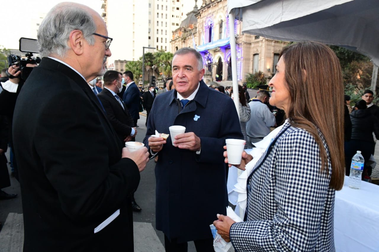 El 25 de mayo comenzó a ser celebrado desde muy temprano en la Plaza Independencia con un chocolate patrio. Tucumanos y turistas participaron de la actividad que fue presidida por el gobernador, Osvaldo Jaldo, que fue acompañado por su esposa, Ana María Grillo, junto al plenario de funcionarios que integran el Gabinete provincial.